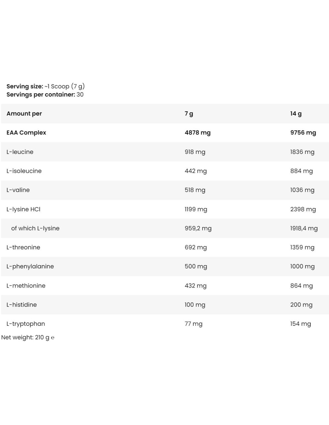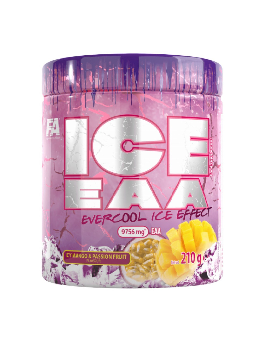 FA ICE EAA 210g незаменими аминокиселини EAAFA ICE EAA осигурява всички основни аминокиселини, включително BCAA, които са необходими за изграждане на мускулна маса. Аминокиселинните добавки играят ключова роля в контекста на регенерацията след тренировка, но не само. Те осигуряват на мускулите ви есенция, която е чудесен начин за изграждане на чиста мускулна маса. Вашите мускули се увреждат по време на тренировка и скоростта на регенерация е от решаващо значение, за да могат да бъдат по-силни и готови за следващото усилие. EAA помагат за бързото възстановяване на мускулите след тренировка, но също така засилват синтеза на нови протеини, което се изразява в скоростта на растеж на мускулната маса.<u>FA ICE EAA 210g е:</u> EAA аминокиселинен комплекс Съдържа BCAA Изгражда мускулна маса Ускорява регенерацията Предпазва мускулите от катаболизъм Освежаващ ICE вкусКакво представляват есенциалните аминокиселини (EAA)?Незаменимите аминокиселини са градивните елементи на протеина, които тялото не може да синтезира само. Това означава, че те трябва да бъдат осигурени чрез диета или добавки. Има девет основни аминокиселини: хистидин; изолевцин; левцин; лизин; метионин; фенилаланин; треонин; триптофан; Валин.Всяка от тези аминокиселини играе жизненоважна роля в различни функции на тялото, включително синтез на мускулен протеин, възстановяване на тъканите и усвояване на хранителни вещества.Как работят EAA аминокиселините?<u>Увеличава синтеза на мускулен протеин</u>Есенциалните аминокиселини са от решаващо значение за синтеза на мускулен протеин. FA ICE EAA 210g осигурява аминокиселинен комплекс EAA, насърчаващ растежа и поддържането на мускулна маса.<u>Намалява мускулната болка</u>Подпомагайки възстановяването на мускулните влакна, FA ICE EAA 210g помага за намаляване на мускулната болка след интензивна физическа активност. Това позволява по-чести и интензивни тренировки.<u>Поддържа производството на енергия</u>Аминокиселините играят роля в производството на енергия, като допринасят за образуването на аденозин трифосфат (АТФ), енергийната валута на клетките. Това означава, че може да изпитате повишени нива на енергия по време на тренировките.<u>Предотвратява разграждането на мускулите</u>По време на интензивни упражнения тялото може да влезе в катаболно състояние, разграждайки мускулната тъкан за енергия. FA ICE EAA помага за предотвратяване на това явление, като осигурява алтернативен източник на аминокиселини, запазвайки мускулната маса.Начин на употреба: - 1 порция преди и една след тренировка