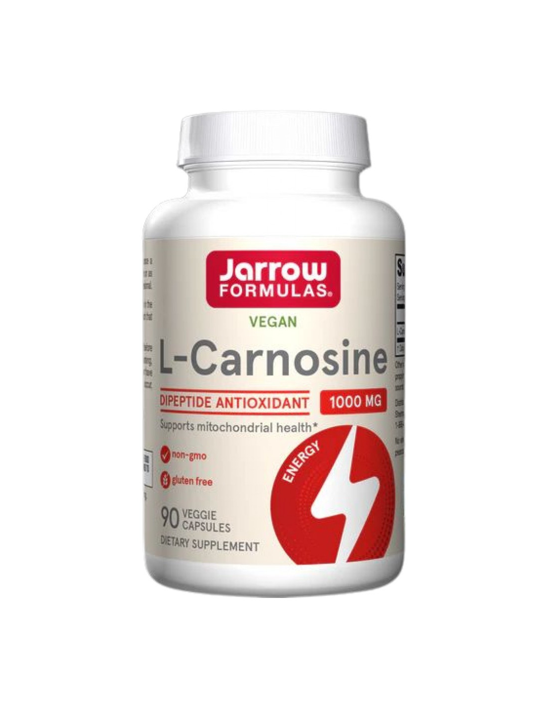 L-Carnosine е дипептид, който се намира в мозъка, сърцето, кожата, мускулите, бъбреците и стомаха. L-Carnosine поддържа здравословното стареене и клетъчното подмладяване чрез неговите ефекти върху два механизма: Гликиране и защита от свободните радикали. Гликирането е неконтролирано напречно свързване на захарни молекули към протеини, този процес е замесен в загубата на клетъчна функция, цялостността на генома и ускорено стареене. L-карнозин също подкрепя мозъчната функция, чрез намаляване на липидната пероксидация и стабилизиране на клетъчните мембрани по време на процеса на стареене.Препоръчителен прием: 1 капсула 1-3 пъти на ден със сок или вода на празен стомах или според указанията на Вашия квалифициран медицински специалист.Забележка: Ако страдате от заболяване, бременна сте, кърмите, опитвате се да заченете, ако сте на възраст под 18 г. или вземате лекарства, консултирайте се с вашия лекар преди да използвате този продукт.Други съставки: Целулоза, магнезиев стеарат (растителен източник) и силициев диоксид. Капсулата се състои от желатин.Не съдържа: Пшеница, глутен, млечни продукти, яйца, риба / миди, фъстъци или черупкови плодове.