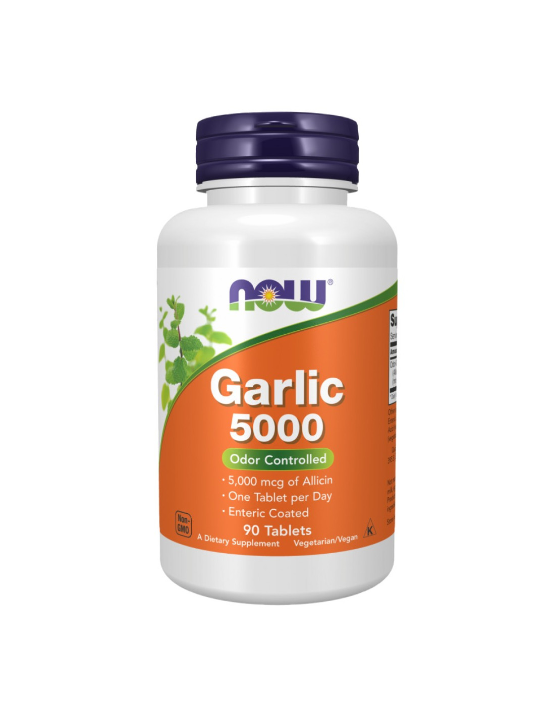 NOW Foods Garlic 5000 | Odor Controlled е хранителна добавка, която ще ви помогне да подсилите имунната си система, да предпазите сърцето от сърдечно-съдови заболявания.NOW Foods Garlic 5000 Odor Controlled ще ви помогне с: Подсилване на имунитета; Предпазване от сърдечно-съдови заболявания; Противовъзпалителни свойства; Чудесен източник на антиоксиданти; Регулиране на кръвната захар.Ако досега не сте били наясно колко полезен е чесънът, вече е крайно време да се убедите в тази истина. Но консумацията на чесън е понякога крайно неприятна и затова много хора го избягват, особено заради лютивия вкус и острата миризма. За да не лишавате своя организъм от тази чудесна природна сила. NOW Foods Garlic 5000 Odor Controlled е хранителна добавка, която съдържа всички ползи на чесъна. А със сигурност знаете колко е важен той за здравето на сърдечно-съдовата и имунната система. Това е може би едно от най-известните растения в света за насърчаване на естествените защитни сили на тялото, особено на сърцето. Чесънът има уникални свойства, които ще помогнат на тялото ви да изгради една по-здрава и силна имунна система, като в същото време ще предпази сърцето от сърдечно-съдови заболявания. Чесънът има и други полезни свойства като регулиране на кръвната захар, тъй като повишава нивата на инсулин в кръвта, чудесен източник на витамин B6, има противовъзпалителни свойства и още много други ползи.Основното вещество на чесъна е алицин, сяросъдържащо съединение, което е естествен антибиотик. Алицинът се получава при смачкването и нарушаването на целостта на скилидките чесън. Много интересен факт е, че първоначално той не съществува. В различни части на здравите скилидки чесън се съдържат две съвсем различни вещества - алиин и ензимът алииназа. Едва когато скилидките биват смачкани и се наруши целостта им, ензимът алииназа катализира формирането на алицин от наличния алиин.Докато алиинът не притежава аромат или цвят, то алицинът е веществото, което придава силния мирис и лютивина на чесъна. Той представлява светложълта, мазна течност, подобна на олио.Смята се, че алицинът, с неговата силна миризма и лютивост, е начинът на чесъна да се предпази от различните вредители, които биха му попречили да се развива като зеленчук.Общо казано, NOW Foods Garlic 5000 Odor Controlled е чудесна хранителна добавка, която може да използвате като заместител, ако не харесвате идеята да приемате този зеленчук, за да не лишавате тялото си от изключителните и полезни качества на чесъна.Хранителната добавка NOW Foods Garlic 5000 Odor Controlled е предназначена за възрастни. Да се държи далеч от деца! Препоръчителна е консултация преди прием за бременни или кърмещи жени, за хора, които приемат лекарства или страдат от някакви болести.Начин на прием: 1 таблетка дневно, препоръчително по време на хранене с 300 милилитра вода.