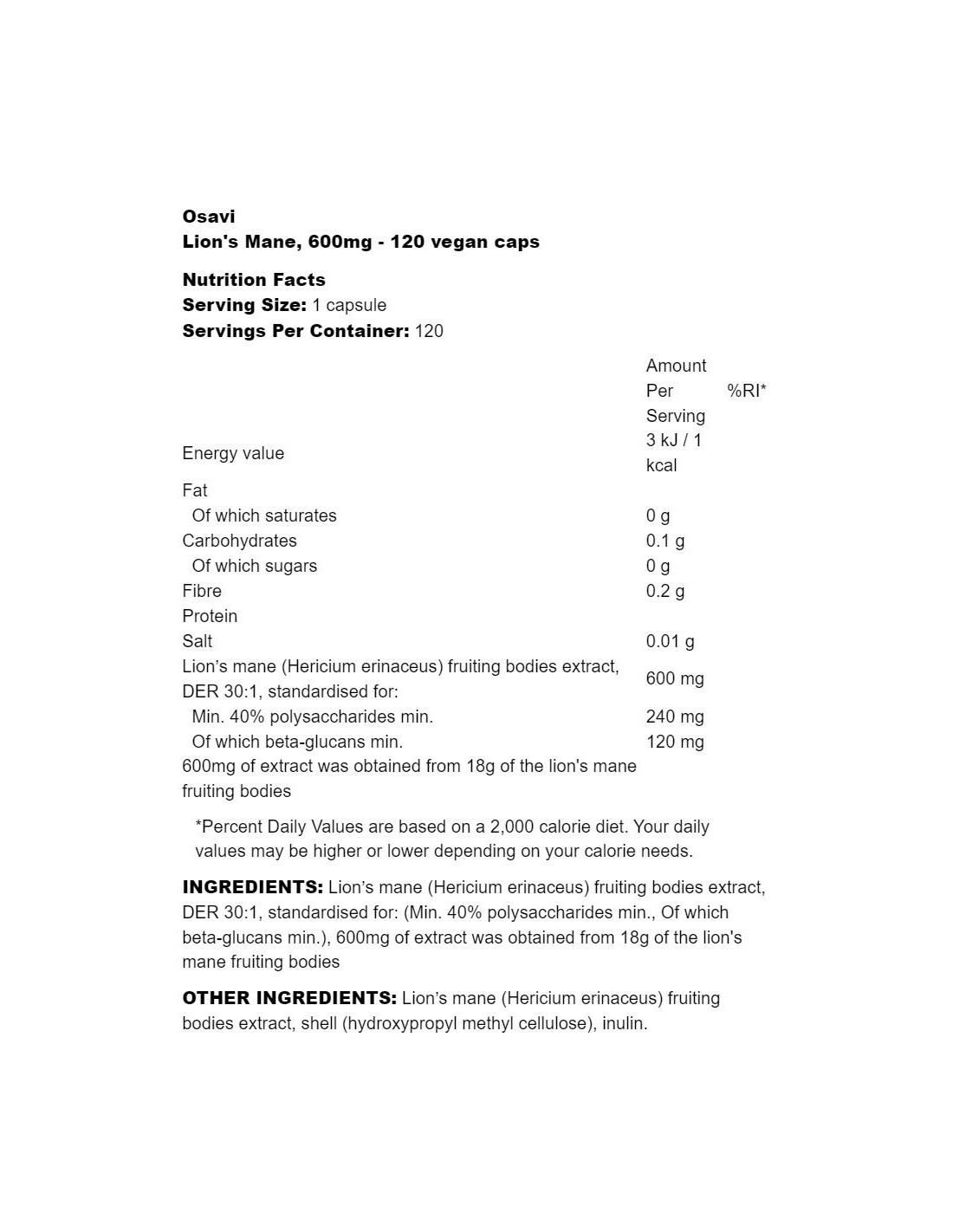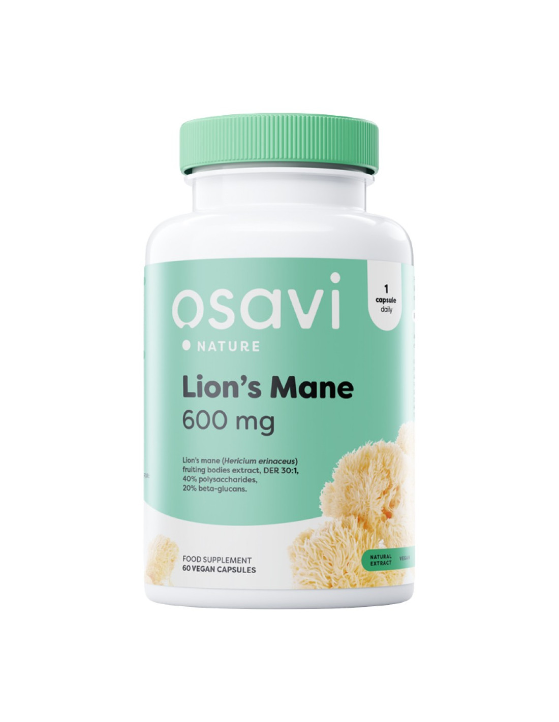 Osavi Lion's ManeХранителна добавка под формата на твърда капсула, съдържаща стандартизиран за полизахариди и бета-глюкани екстракт от плодни тела на лъвска грива (Hericium erinaceus).За да поддържате доброто настроение и мозъчната функция, в допълнение към питателната диета, редовните упражнения и достатъчно сън, си струва да помислите за добавка с ядливата гъба Лъвска грива. Биоактивните компоненти, които съдържа, показват редица ползи за здравето. Те са източник на антиоксиданти, участващи в неутрализирането на свободните кислородни радикали, отговорни за преждевременното стареене, а също така имат положителен ефект върху умствената дейност, нервната система и съня.Лъвската грива (Hericum erinaceus), известна още като гъба с брадат зъб или брадат таралеж, е ядлива гъба, често срещана в страните от Източна Азия, която се използва от много години за поддържане на здравето на мозъка, нервната система и стомашно-чревния тракт . Полезните му свойства се дължат, наред с други неща, на наличието на полизахариди, които включват бета-глюкани. Бета-глюканите имат антиоксидантни ефекти, предпазвайки тялото от оксидативен стрес и действат като фибри, които регулират усвояването на холестерола, подпомагат правилното храносмилане и участват в синтеза на късоверижни мастни киселини (SCFA), които са полезни за нашите черва . Брадатият таралеж може да поддържа експресията на BDNF протеин в мозъка, което насърчава доброто настроение, което улеснява намаляването на теглото и мазнините. В пилотно проучване, включващо група доброволци с наднормено тегло и затлъстяване, които спазват диета с калориен дефицит и приемат добавки с екстракт от брадат таралеж, се наблюдава подобрено настроение, по-добър глад и контрол на ситостта, намаляване на честотата на епизодите на преяждане и подобрено качество на съня . Въз основа на наблюдения на участници с нормална когнитивна функция, на които е даден екстракт от лъвска грива, беше отбелязано добро представяне в тест за краткосрочна памет, което може да предполага потенциален благоприятен ефект на лъвската грива върху функцията на мозъка и нервната система.Нашата хранителна добавка Лъвска грива 600 mg съдържа екстракт от плодното тяло на брадат таралеж (Hericium erinaceus), стандартизиран до 40% полизахариди, 20% бета-глюкани. Това, което го прави уникален, е двойната стандартизация на суровината. Високото качество на добавката се определя от съдържанието на най-значимите съединения, т.е. бета-глюканите, които представляват почти половината от полизахаридите в продукта! 1 капсула съдържа 600 mg екстракт, получен от 18 g плодни тела на Hericium erinaceus (DER 30:1). Дневна порция от 1 капсула е източник на 240 mg полизахариди, включително до 120 mg бета-глюкани. Продуктът не съдържа захар, глутен, лактоза, соя, ГМО и е подходящ за вегани и вегетарианци. Лъвската грива е отлична подкрепа за нормалната функция на мозъка, нервната система и защитата на организма от свободните радикали!Начин на употреба: - 1 капсула 2 пъти дневно с храната