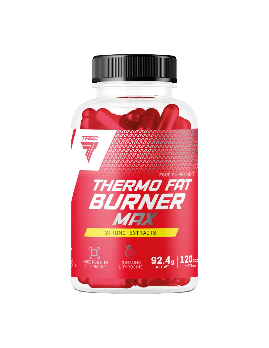 THERMO FAT BURNER MAX съдържа стандартизирани зеленчукови екстракти от гуарана, зелено кафе, бял и зелен чай, които са богати на биоактивни вещества. THERMO FAT BURNER MAX е допълнително допълнен с L-карнитин и хром – минерал, допринасящ за нормалния метаболизъм на макронутриентите и за поддържане на нормално ниво на кръвната захар.Препоръчителната дневна доза е 4 капсули. ДОПЪЛНЕН С L-КАРНИТИН ДОПЪЛНЕН С ХРОМ, ДОПРИНАСЯЩ ЗА НОРМАЛНИЯ МЕТАБОЛИЗЪМ НА МАКРОНУТРИЕНТИТЕ СЪДЪРЖА СТАНДАРТИЗИРАНИ ЗЕЛЕНЧУКОВИ ЕКСТРАКТИПриемайте една доза от продукта ‒ 2 капсули с 300 мл вода. Приемайте 2 порции дневно, за предпочитане 30 минути. преди тренировка.Моля обърнете внимание:Не приемайте на празен стомах! Не приемайте преди лягане! Не използвайте кофеин от други източници. ПРЕДУПРЕЖДЕНИЯ:Не превишавайте препоръчителната дневна доза. Не използвайте продукта като заместител на разнообразното хранене. Деца, бременни или кърмещи жени не трябва да приемат продукта. Не използвайте продукта в случай на проблеми с кръвоносната система или чувствителност към кофеин. Да не се комбинира с алкохол! Продуктът съдържа нарингенин, който може да повлияе на чревната абсорбция на определени лекарства, което води до временни промени в техния метаболизъм. Разнообразното и балансирано хранене и здравословният начин на живот са важни. Продуктът може да съдържа алергени като: мляко, соя, пшеница, ечемик, овес, яйца, фъстъци и ядки.СЪХРАНЕНИЕ:Съхранявайте тази опаковка плътно затворена на сухо място, при температура 15-25°C. Да се пази извън обсега на деца.НАЙ-ДОБРО ПРЕДИ КРАЙ, ПАРТИДЕН НОМЕР, СТРАНА НА ПРОИЗХОД:Вижте страната на опаковката и заварете.СЪСТАВ: екстракт от гуарана [семена] (Paullinia cupana) [22% кофеин]; L-карнитин тартарат; безводен кофеин; обвивка на капсулата (желатин; оцветители – титанов диоксид, железни оксиди и хидроксиди); екстракт от зелен чай [листа] (Camellia sinensis) [55% EGCG]; L-тирозин; екстракт от зелено кафе [семена] (Coffea canephora) [50% ACG]; средство против слепване – магнезиеви соли на мастни киселини; екстракт от грейпфрут [плод] (Citrus paradisi) [98% нарингенин]; екстракт от черен пипер [плод] (Piper nigrum) [95% пиперин]; хром (хром пиколинат).