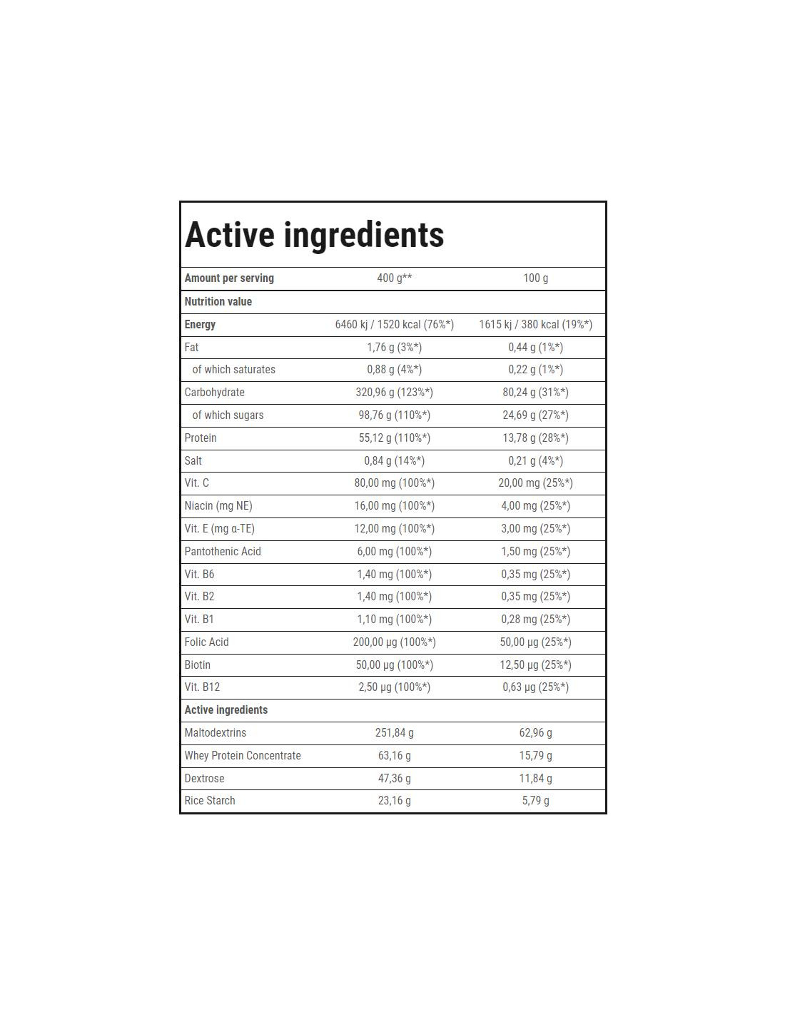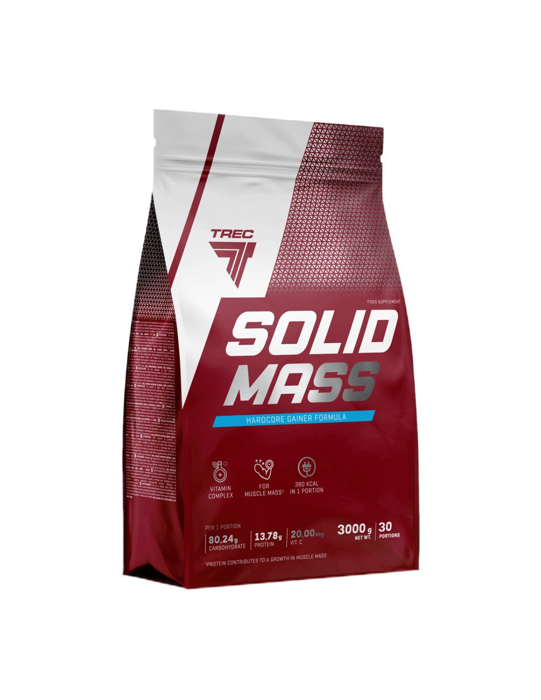ПредназначениеПомогнете на своя организъм да изгради надеждна рамка от мускулни влакна, която не само ще защити вашето тяло от голям набор възможни травми, но и ще стане причина за гордост и респект. С продукта за покачване на тегло Solid Mass няма нищо невъзможно. Източника на ценни протеини и енергийно заредени въглехидрати от Trec Nutrition е идеално допълнение към всяка диета за покачване на тегло.• Оптимизира инсулиновата реакция за постигане на максимален растеж• Страхотен вкус• Въглехидрати с нисък гликемичен индекс Как работи?Превъзходните вкусови характеристики, отличното съчетание на незаменими и условно незаменими аминокиселини, прости и комплексни въглехидрати, а също и висококачествен суроватъчен протеин концентрат отличава Solid Mass от множеството му конкуренти на световния пазар за специализирани спортни добавки. Добре обработения състав от активни съставки, които се съдържат в продукта, позволява на Trec Nutrition да създаден уникален по своята био-достъпност продукт, който е способен да увеличи азотния оксид в тялото, а също така и да подготви клетките на мускулите за активно възстановяване и синтез на протеин, което създава оптимални условия за растеж. Високото съдържание на аминокиселини в този въглехидратно-протеинов комплекс включва в състава значително количество аминокиселини с разклонена верига BCAA и глутамин, а също така и глутаминови киселини. Този съединение от аминокиселини дава ненадминати антикатаболни свойства и заедно с енергията от въглехидратите, позволява провеждането на по-продуктивни и интензивни тренировки.Ако сте избрали да упражнявате тежък и високо-интензивен спорт, като бодибилдинг или силов трибой и крайно се нуждаете от допълнителен приръст на качествена и мощна мускулатура, възползвайте се на 100 процента от доказалото се средство Solid Mass и успехът в това сложно начинание ще бъде гарантиран. Начин на употреба: Разтворете 1 доза от продукта (100г) в 250мл вода или мляко. В зависимост от нуждите Ви приемайте 3-4 дози на ден. В тренировъчни дни: 1 доза след ставане, 1 доза преди, 1 доза 1,5 часа след тренировка, 1 доза между храненията. В нетренировъчни дни: 1 доза след ставане, останалите дози между храненията.