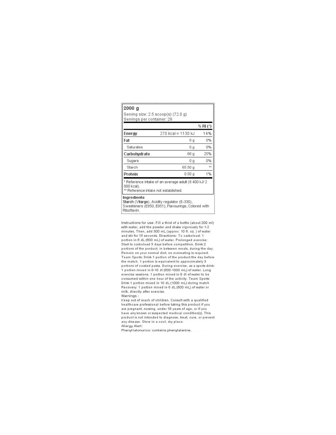 VITARGO Carboloader представлява патентована въглехидратна формула с подобрено усвояване, която повишава обема на чистата мускулна маса и увеличава енергията по време на натоварващи тренировки. ➡ Повишава енергията➡ Стимулира натрупването на мускулна маса➡ Подпомага чернодробната дейност➡ Повишава издръжливостта➡ Намалява умората➡ Оказва подкрепа при възстановяване➡ Подобрява синтеза на протеини➡ Стимулира метаболизма VITARGO Carboloader съдържа патентована въглехидратна формула, която стимулира синтеза на гликоген в мускулната тъкан. Гликоген повишава енергията на мускулите и има благоприятно действие върху черния дроб. Той увеличава чистата мускулна маса, като стимулира притока на кръв в мускулите, а също така подобрява оросяването на мозъка. Тази формула позволява на въглехидратите да преминат по-бързо през стомаха и да се влеят в кръвния поток.Формулата на VITARGO Carboloader е обогатена с лесния за усвояване малтодекстрин, който повишава издръжливостта, намалява умората и ускорява процеса на възстановяване. Тази хранителна добавка съдържа D-глюкоза, наречена още декстроза, която се усвоява значително по-бързо от организма. Глюкозата е един от най-важните въглехидрати за човешкия организъм и има изключително важна роля за синтеза на протеин. Глюкозата е мощен източник на енергия и има свойства да подпомага метаболизма. Начин на употреба : Смесете 75 гр. с вода и приемайте 2 пъти дневно между храненията. Възползвай се от предимствата на VITARGO Carboloader на гарантирано най-ниска цена още днес!