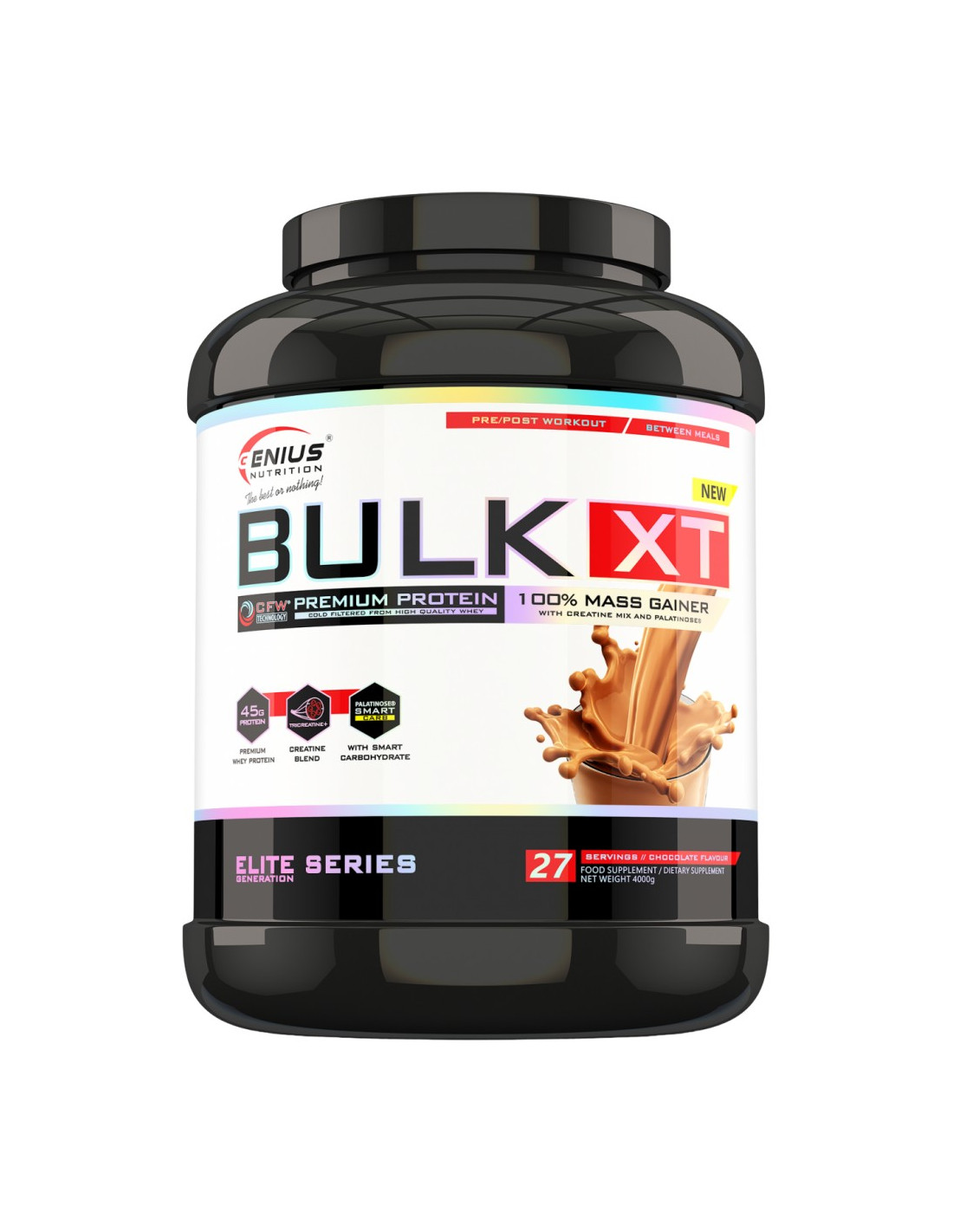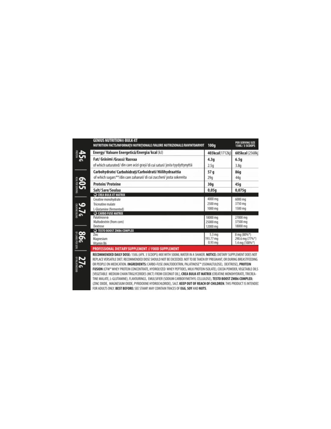Много хора преувеличават важността на тренировката, когато става въпрос за трупане на мускули. Всъщност, тренировката е неизбежна, но основата е диетата, която трябва да бъде редовна, честа и с високо ниво на калориите.Когато казваме висок прием на калории - ние имаме предвид висококачествена диета с калории, които ще ви позволят да изградите мускулна маса. Често, такава диета е трудна за прилагане, въпреки че е основата за всичко.ИМА САМО ДВА ДОКАЗАНО БЕЗОПАСНИ НАЧИНА ЗА УВЕЛИЧАВАНЕ НА МУСКУЛИТЕ. . . ЗАПОЗНАЙТЕ СЕ С ЕДИНИЯАко винаги ви е било трудно да увеличите теглото или мускулите си, главно заради това, че ви е било трудно да приемете повече калории, отколкото тялото ви изгаря, тази добавка е за вас.Вече няма кльощави момчета във фитнесите ни.GENIUS NUTRITION® BULK-XT iе високопротеинова формула, предоставяща ви калории, които се броят по време на възстановяването. Всеки шейк, който изпиете, ви предоставя допълнителни протеини, въглехидрати, витамини и минерали, за да изградите количеството, което получавате чрез балансираната диета.Нейните свойства покриват нуждите на напредналите атлети, които изгарят големи количества калории през деня, като същевременно се опитват да запазят или да увеличат мускулната маса.Използвайте GENIUS NUTRITION® BULK-XT като шейк за възстановяване след тренировка или високопротеиново ястие преди храненията. Но важни ли са калориите за повишаването на мускулната маса?Да, особено за тези с развит метаболизъм, на които им е трудно да приемат достатъчно качествени калории през деня. Калориите са изключително важни за поддържането на мускулната маса, защото запазва изградената мускулатура от това, да бъде използвана като гориво по време на тежки тренировки.Също така, GENIUS NUTRITION® BULK-XT съдържа креатин, които има позитивен ефект върху здравината и издръжливостта на мускулите, особено по време на интензивни тренировки. Формулата е обогатена с витамини, които, в допълнение към подпомагането на здравословното състояние и имунитета, също така помагат и за намаляването на умората.Усеща се, сякаш мамите.Комбинацията от прости и сложни въглехидрати (декстроза и малатодекстрин) ще ви предоставят енергия по време на дълги тренировки. Богатия комплекс витамини и минерали ще компенсира загубата на микроелементи поради дехидратация, причинена от интензивната тренировка.Трябва да имате предвид, че трябва да положите усилия ако сте СЕРИОЗНИ за покачването на мускулна маса/тегло. Това няма да стане само по себе си. Трябва да положите усилия, както и най-вече да бъдете търпеливи и ОТДАДЕНИ!Не го отписвайте преди да го изпробвате!В допълнение към висококачествения си състав, тази променяща тялото добавка предлага не по-малко от изкусителен вкус: ние създадохме вкус на шоколад и ягода. Всяко едно от ястията GENIUS NUTRITION® BULK-XT ще бъде истинско удоволствие, точно като посещение във фабрика за бонбони. Подкрепя целите ви за покачване на маса с висококачествен протеин Възстановява нивото на енергия Високо съдържание на въглехидрати Бързо възстановяване на гликоген (въглехидратни резерви на мускулите) след тренировка Чудесен продукт за след тренировка или между храненията Смесва се без усилия КАКВО ИМА В 1 ПОРЦИЯ/150g Въглехидрати (57gr) Протеин (30gr) Сол (0,05gr) Креатин монохидрат (4000mg) Трикреатин малат (2500mg) L-Глутамин (1000mg) Палатиноза (18000mg) Малтодекст