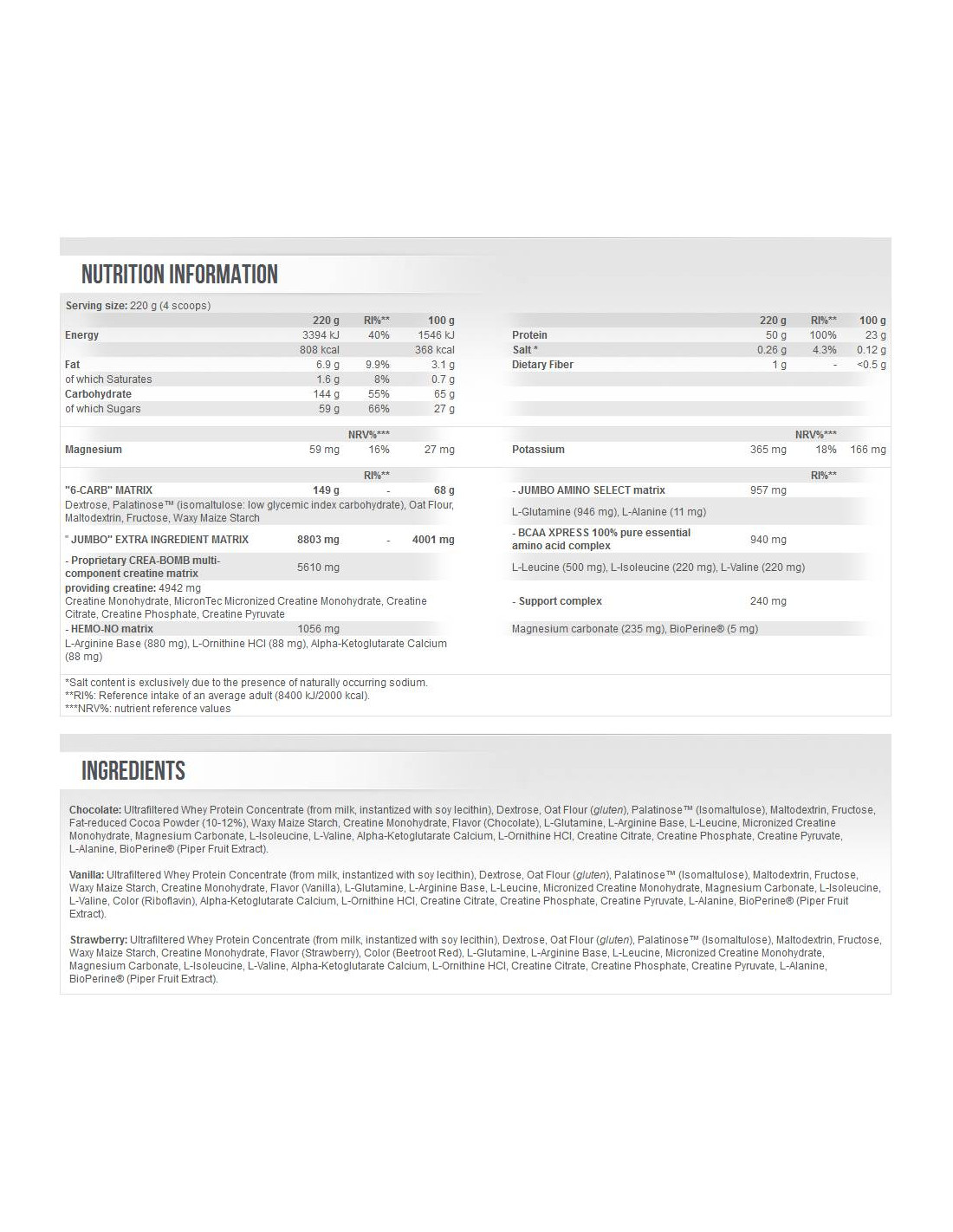 ➡ 50 грама протеин в ДОЗА!➡ ОГРОМНА доза Анаболна Матрица!➡ "6-CARB" карбохидратна матрица съдържаща бързи и бавни въглехидрати!➡ Без изкуствени подсладители!➡ Удобна опаковка!JUMBO означава ГОЛЯМ! JUMBO oзначава...