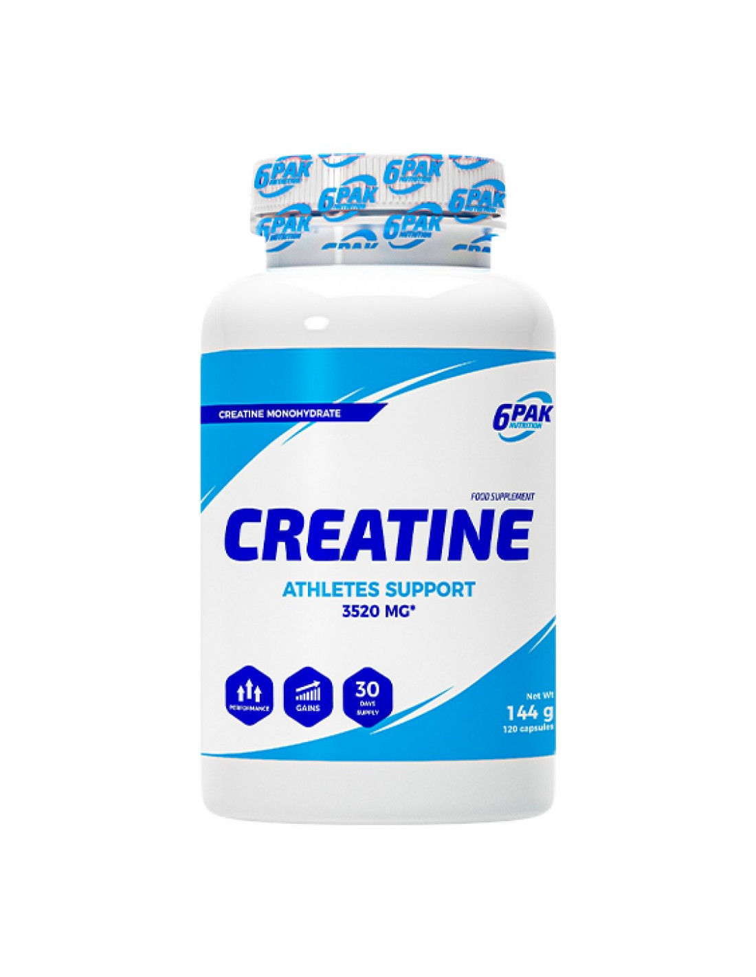 Creatine от 6PAK е добавка от най-високо качество, в чийто състав няма да намерите ненужни добавки. Благодарение на това всяка порция е богат източник на чист креатин монохидрат. Само 3 г на ден са достатъчни, за да усетите пълния му потенциал. Продуктът се предлага под формата на удобни и изключително практични капсули. Благодарение на тях дохранването става бързо и безпроблемно.Креатинът се радва на неотслабваща популярност от много години, което не е случайно. Особено се препоръчва за хора, които провеждат интензивни тренировки, тъй като именно при тях се вижда силата на действието му. Според съвременните познания, креатинът увеличава интрамускулното количество креатин, което се изразява в подобрена производителност по време на интензивни упражнения. Това означава и по-добра адаптация на тялото към тренировъчни натоварвания, което се изразява в максимизиране на спортните резултати. Правилно проведеното добавяне на креатин също помага за подобряване на регенерацията след тренировка и повишава толерантността към тренировъчното натоварване. Хранителна добавка под формата на капсули Предтренировъчна формула на базата на креатин под формата на креатин монохидрат повишава физическата работоспособност при последователни кратки, много интензивни физически упражненияНачин на употреба:Приемайте по 4 капсули на ден с достатъчно количество вода. Приемайте по 1 порция дневно: сутрин, преди или веднага след тренировка. Използвайте в тренировъчни дни. Препоръчителната дневна доза е 4 капсули. Не превишавайте препоръчителната дневна доза.