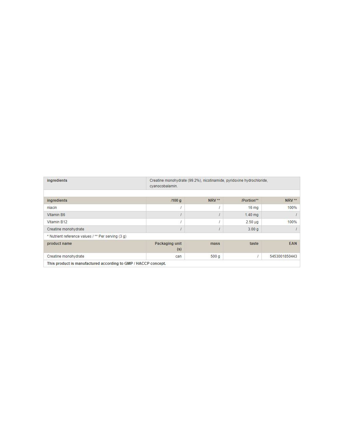 100% чист креатин монохидрат в прахообразна форма е класиката сред креатиновите продукти. Креатинът представлява аминокиселина, състояща се от три свързани аминокиселини - аргинин, глицин и метионин. Установено е, че 95% от общото количество в тялото ни (под формата на монохидрат и фосфат) се съдържа в мускулната тъкан. Благодарение на по-големия запас на аминокиселината в клетките, мускулите могат да постигнат много по-голяма работоспособност, респ. по-бърз растеж и изграждане на чиста мускулна маса от обикновено. Известно е също, че креатинът повишава снабдяването на организма с вода, което води до подпомагане на анаболното обкръжение и от своя страна се отразява добре на синтеза на нови протеини и свежда до минимум катаболните процеси. Когато този продукт се появи на пазара преди 10 години, той се превърна в сензацията при храненето на спортистите и струваше цяло състояние (преизчислено, около 300 евро/кг)! Използван като добавка към диетата на културиста, Creatine Powder спомага за бърз и сериозен напредък в мускулното развитие. Около тридесет научни изследвания показват, че вземането на креатин стимулира покачването на бедна на мазнини маса, като най-впечатляващото натрупване на мускули е било наблюдавано (в продължение на три месеца) при лица, провеждащи тренировки с допълнително натоварване между 80% и 120% от нормалната им максимална сила.Начин на употреба : Creatine Monohydrate - 3 г (около 1 чаена лъжица) разтворени в 300 мл течност (не мляко), веднага след тренировка. В нетренировъчен ден сутрин след ставане.