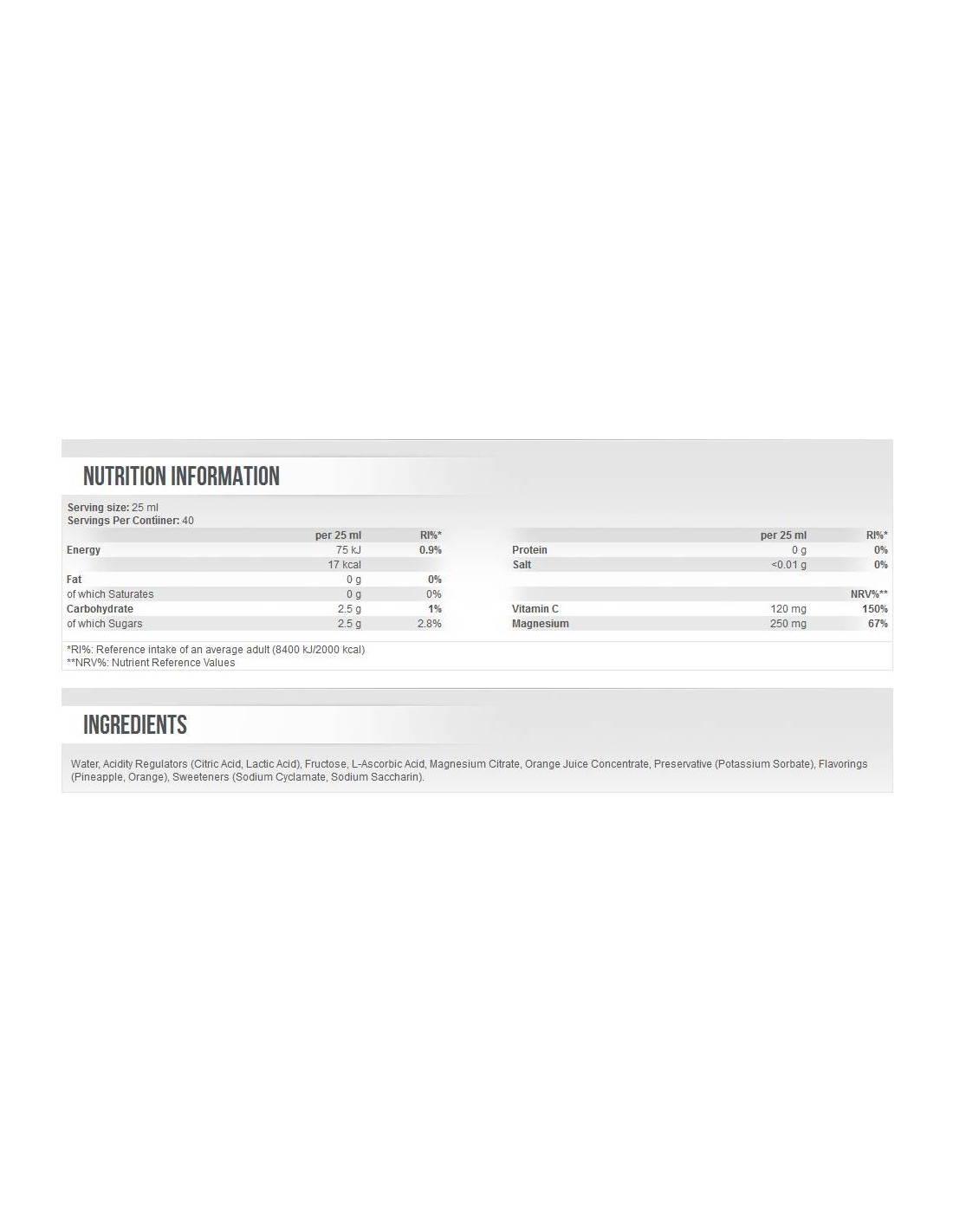 Магнезият е необходим за правилната минерализация на костите, за мускулните контракции и предаването на нервни импулси. Настоящата формула ви доставя лесно усвоим магнезий в течна форма – за по-бърза и ефикасна абсорбция. Продукта е подсилен и със 120 mg витамин С.Внимание: Подсладените течни продукти могат много лесно да бъдат предозирани! Употребявайте внимателно и винаги използвайте мерителната чашка! Този продукт не е предназначен за диагностика, лечение или превенция на заболявания!Начин на употреба: 1 доза 30 минути преди тренировка