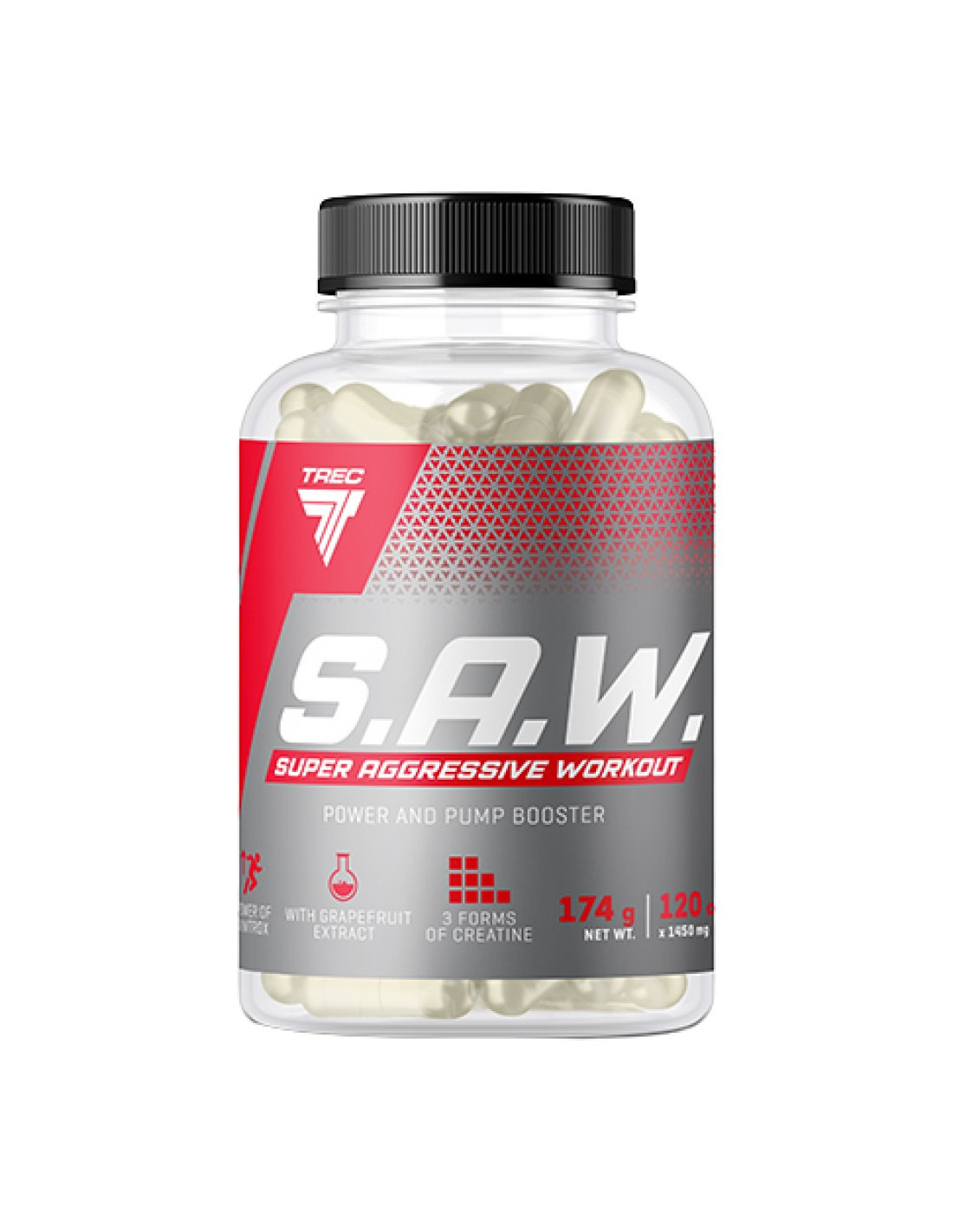 TREC S.A.W Ако сте професионален спортист или просто тренирате усилено, ако сте опитвали различни продукти, но те не дават желания резултат, време е да опитате нещо ново и ефективно – S.A.W. от TREC. S.A.W. - Super Workout Anabolic е ултра-концентрирана формула за активни спортисти. Свойствата му за повишаване на мускулната маса увеличават размера на активните мускули, като осигуряват допълнително кислород и хранителни веществана мускулните влакна. Предимства: Ултра концентрирана пред-тренировъчна формула Подпомага изграждането на мускулна маса Стимулира метаболизма и изгарянето на мазнини Повишава притока на енергия Подобрява издръжливостта Подпомага възстановяването след тренировка Не съдържа захар, добавки и филъри Високата концентрация от активни съставки в SAW го превръща в най-силния и най-мощния пред-тренировъчен продукт, произвеждан някога от Trec Nutrition. SAW не съдържа захар, добавки и филъри. Този продукт е чиста, концентрирана енергия за спортисти. Комбинация от мощни активни съставки, включително и полифеноли, съдържащи се в ябълките и гроздето, активира ензимите в организма, които подпомагат синтеза на азотен окис. По този начин, SAW подпомага и поддържа нормалното кръвообръщението за по-дълъг период, в сравнение с други подобни продукти. Как действа SAW? По време на тренировка, мускулите се съкращават и снабдяват с кръв, увеличават се нивата на енергия и сила, а симптомите на умора намаляват. Чувствате се по-фокусиран, сетивата се изострят и можете изцяло да се съсредоточите върху постигането на оптимлани резултати от тренировката. Вече няма да чувствате болка и дискомфорт след интензивно натоварване. Увеличавайки мускулния обема, ще стимулирате метаболизма и ще изгорите повече калории. Високо интензивните упражнения водят до ускоряване метаболизма на мускулните клетки. Препоръчителен дневен прием: 4 капсули преди тренировка. Дозата се определя спрямо Вашите изисквания, интензивност на упражнения и чувствителност към добавката. Консумирайте 30 минути преди тренировка.