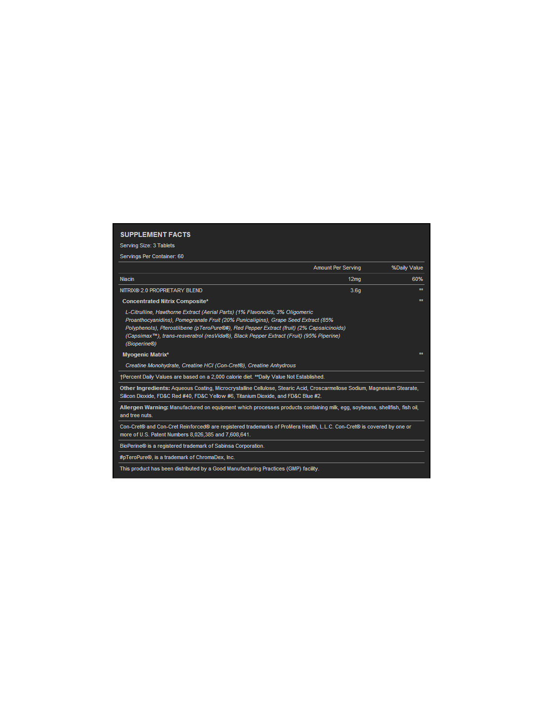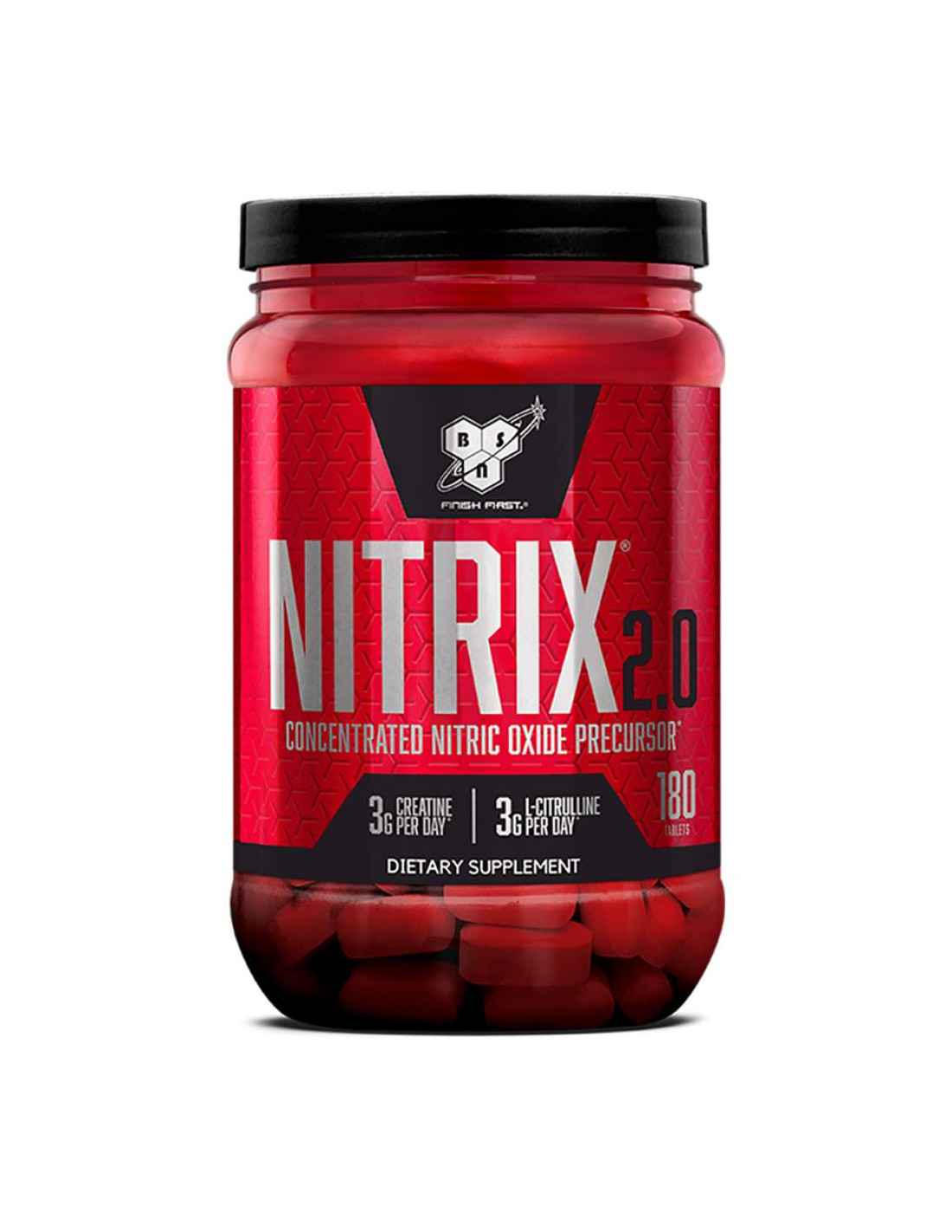 Nitrix 2.0 ще стимулира: Напомпванията в мускулите Силовата издръжливост Нивата на азотен оксид в кръвта Представянето по време на тренировкаNitrix 2.0 е последният шедьовър сред концентрираните формули от прекурсори на азотния оксид, които са създадени с цел да поддържат васкуларизацията, издръжливостта и силата. Ключът в новата пременена формула на Nitrix 2.0 е добавянето на 3 грама цитрулин, един от най-мощните и ефективни прекурсори на азотен оксид, както и на изключителния Con-Cret (creatine HCL). Тази свръхефективна комбинация поставя Nitrix 2.0 сред уникалните формули и още веднъж демонстрира, че BSN са отдадени изцяло на иновациите и мисията им е да водят света на хранителните добавки към бъдещето.[/b]поставя ценна основа за всички останали суплементи и физическите усилия, които ще вложите. И не по-малко важен е фактът, че Nitrix 2.0 става все по-удобен за употреба, като сложната формула е събрана само в доза от 3 таблетки. Начин на употреба : За да се постигне максималният ефект от Nitrix 2.0 е нужен прием от 3 таблетки, 60 минути преди тренировка, на празен стомах. След тренировката, приемете още 3 таблетки, които могат да бъдат комбиниране със Cellmass 2.0. В нетренировъчните дни, приемайте 3 таблетки, 2 пъти дневно, на гладно. В рамките на един ден не приемайте повече от 6 таблетки.Внимание : Консултирайте се с вашия лекар преди да използвате продукта ако употребявате лекарства или сте под лекарско наблюдение поради болестно състояние. Да не се употрябва от лица под 18-годишна възраст, от жени, които са бременни, опитват се да забременеят или кърмят, както и от индивиди, които са чувствителни към ниацин. Да се пази от деца и домашни животни. Съхранявайте на сухо място, далеч от слънчева светлина.