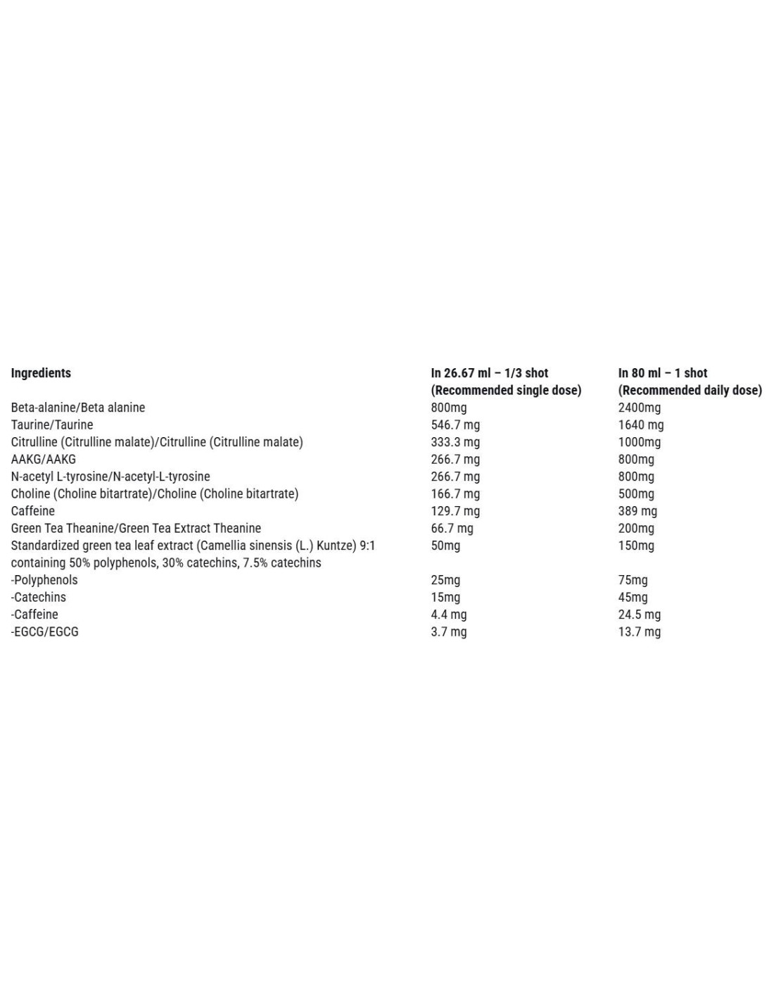 Hero.Lab Mad Kong Pre-Workout Shot е силно концентриран предтренировъчен стимулант, създаден да увеличи енергията, издръжливостта и концентрацията по време на тренировка. Формулата му включва мощни активни съставки, които ускоряват метаболизма, подобряват физическата издръжливост и стимулират фокуса, което прави всяка тренировка по-интензивна и ефективна.Начин на употреба: Разклатете добре шишето преди употреба. Пийте 1 доза (1 шот) около 20-30 минути преди тренировка. Не се препоръчва употребата на продукта в късните часове на деня, поради съдържанието на кофеин.