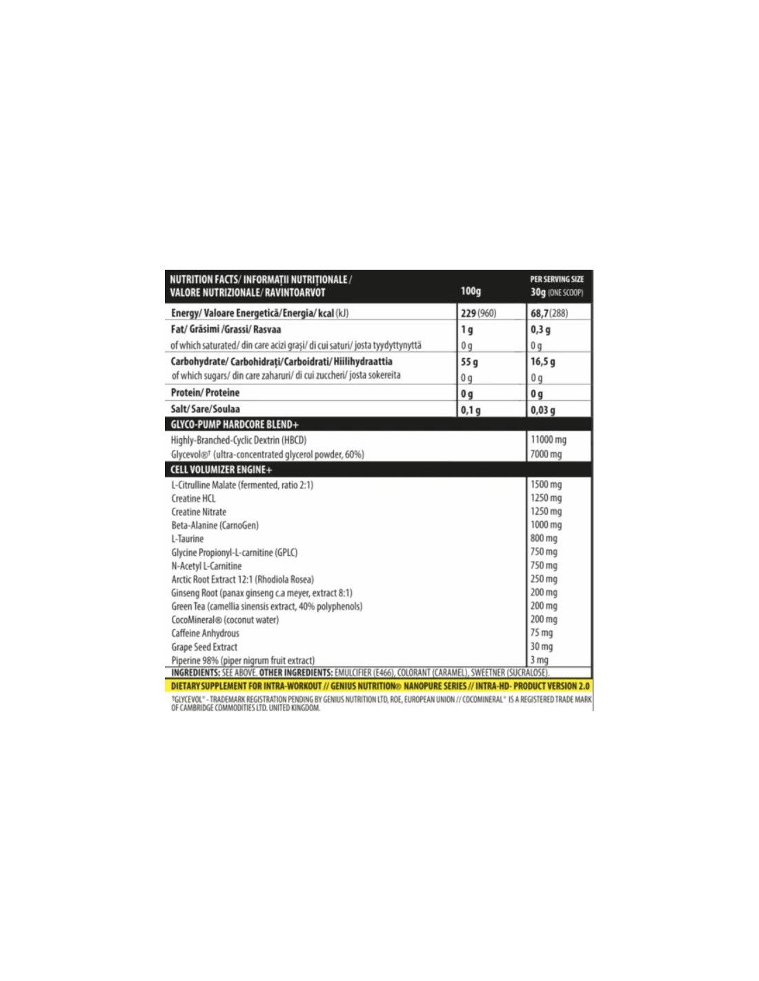 Супер промяна по време на тренировкаАко се намирате в една от следните ситуации помислете да започнете приемането на добавки по време на тренировката: Не ходите на фитнес. Чувствате се уморени по всяко време Не можете да се концентрирате докато работите Искате да намалите разграждането на мускули по време на тренировка Вие сте на нисковъглехидратна диета и ви липсва енергияПродуктите предназначени за употреба по време на тренировка могат да ви изведат на напълно ново ниво. Това не само ще увеличи силата и издръжливостта ви, но и синтеза на протеини, ще ускорят метаболизма ви, ще намалят загубата на мускули и ще създадат оптимална хормонална среда за растеж на мускулите.Някои не могат да издържат без помощ… НОВО ПОКОЛЕНИЕ ПРОФЕСИОНАЛЕН ПРОДУКТ ПРЕДНАЗНАЧЕН ЗА УПОТРЕБА ПО ВРЕМЕ НА ТРЕНИРОВКАНай-новото творение на Genius Nutrition® всъщност е уникална и всеобхватна добавка, която включва голямо разнообразие от естествени съставки с множество ползи, които ви дават възможността да извършите повече повторения.Новият продукт Intra-HD за преди тренировка е разработен за да повиши издръжливостта и силата ви и да ви предостави достатъчно енергия по време на тренировка. В сравнение с други подобни продукти, той ви осигурява постоянна енергия по време на тренировка, дори и ако е по-дълга от 120 минути. Няма значение, дали вдигате тежести в продължителен период от време или извършвате интензивна тренировка за 30 минути, Intra-HD ще ви даде точно това, от което имате нужда.Intra-HD е източник на изключителна сила, здравина и особено, чудесно чувство, което е гарантирано, независимо кой е любимият ви спорт.Това е напълно ново поколение професионална добавка, предназначена за използване по време на тренировка и за допълване с гликоген, който ефективно спира катаболизма, увеличава възстановяването на чистата мускулна маса и осигурява ново изключително ниво на представяне.Продуктите, предназначени за употреба преди тренировка са перфектни, но колко дълго или колко много можете да вдигате?Intra-HD прави и двете.Също така, той може да осигури много бързо да изчисти стомаха, като го прави изключително ефективен за запълване на нивата на гликоген без страничните ефекти на бързите въглехидрати.Без удари или пикове, само постоянно високо ниво на енергия.Intra-HD ще ви предостави допълнителна издръжливост и сила, за да издържите по време на интензивната тренировка и ще ви даде лазерен фокус. Отвъд гладката енергия и без удари, няма съмнителни и недоказани съставки.Също така той увеличава разхода на енергия при почивка със 70% увеличава количеството изгаряни мазнини. С други думи, вие ще повишите метаболизма си и ще изгаряте повече мазнини и ще попълвате повече гликоген.Всичко това докато получавате тяло, което ще обичате и в което ще се чувствате уверени…Решението за добавяне на L-цитрулин малат вместо стандартния L-цитрулин е от огромна полза за вас, като се има предвид обширното изследване, подкрепящо малата като по-превъзхождащата от двете аминокиселини.По подобен начин, Intra-HD разполага с правилната доза кофеин, с която да се почувствате изпълнени с енергия когато прекрачите прага на фитнес залата, която ще ви накара да се почувствате изключително будни. повишена производителност подобрен умствен фокус устойчива енергия без лоши добавки без празни калории няма нужд