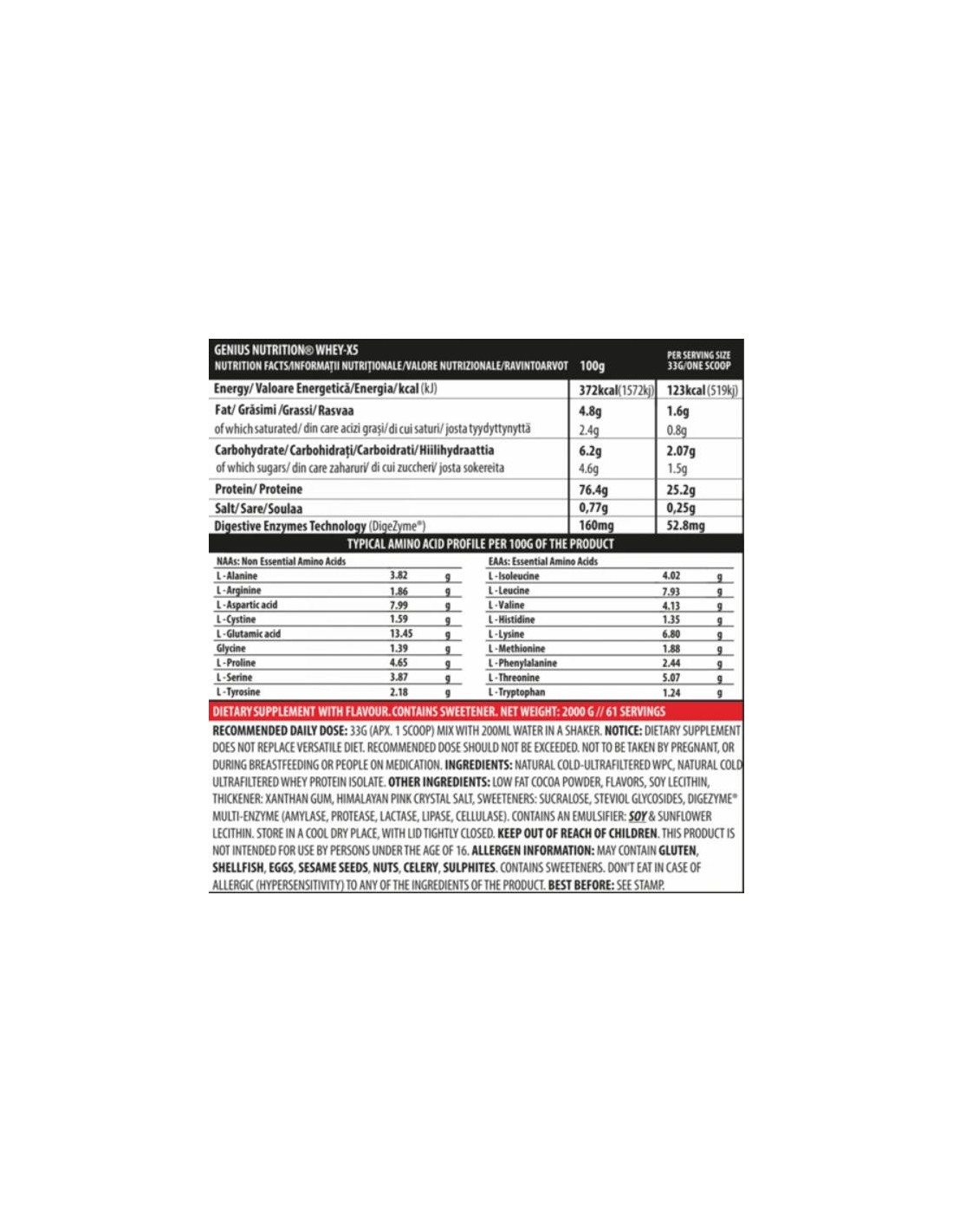WHEY-X5 е прецизно формулиран за да ви помогне да натрупате и да поддържате мускулна маса без мазнини. Това се постига чрез бързото усвояване на суроватъчен протеин изолат и протеинов концентрат. Ние използваме възможно най-добрите аминокиселини с висока доза BCAA (5.3 g на доза), които се появяват по естествен път в суроватъчния протеин. Genius Nutrition използва най-високо качество 100% суроватъчен протеин, добит чрез естествена филтрация, който има високи свойства на абсорбиране и храносмилане, в комбинация с DIGEZYME® (храносмилателни ензими). WHEY-X5 има превъзходни хранителни свойства, които са важни за всеки, които иска да изгради мускулна маса без да съхранява мазнини, като същевременно продукта има невероятен вкус.КАКВО ИМА В WHEY-X5®Концентрат на суроватъчен протеин и изолат на суроватъчен протеин, добити чрез технология за естествено студено филтриране (CWF®), която съдържа висока доза незаменими аминокиселини (тези, които тялото не може да произведе). Суроватъчният протеин е най-богатият източник на аминокиселини и левцин. Изследователите са установили, че повишените нива на левцин в кръвообращението подсилват протеиновия синтез. Проучванията показват, че суроватъчният протеин, консумиран преди или след упражнение бързо увеличава скоростта на протеиновият синтез в мускулите. Суроватъчния протеин се абсорбира бързо и съдържа повече левцин от други източници на протеин. Редовното приемане на суроватъчен протеин е идеално за повишаване и поддържане на мускулната маса по време на хранителен режим да отслабване/оформяне на мускулите, когато е в комбинация с тренировка.Digezyme® (храносмилателни ензими)Тези ензими ви помагат да разградите пептидите с къса и дълга верига на по-малки и по-лесно усвоими аминокиселини за максимално храносмилане и без да губите погълнатия Whey-X5 протеин.Естествени вкусовеТази формула съдържа само естествени вкусове, няма изкуствени оцветители и използва най-безопасните подсладители.Защо WHEY-X5® Превъзходен аромат и вкус 25 g протеин на доза Висока доза BCAA – 5.3 g Подиква растежа на мускулната маса Оптимизира представянето и възстановяването след тренировка Без добавени въглехидрати или захари Смесва се и се храносмила бързо Храносмилателни ензими за най-добро абсорбиране Без добавени аминокиселиниУказания за употреба В тренировъчни дни: Добавете 1 лъжичка в чашата на шейкъра си и залейте с 200-300 ml студена вода. Покрийте и разбъркайте за 20-30 секунди. Консумирайте 1 лъжичка 30 минути преди тренировка и още 1 лъжичка веднага след тренировка. В дни без тренировка: Консумирайте 1 лъжичка сутрин и още една между храненията.↻ Можете да приемате повече дози в зависимост от изчисления прием на протеин.Внимание! Хранителните добавки са предназначени само за здрави хора. Не приемайте добавката ако сте бременна или кърмите. Дръжте далеч от деца. Тази хранителна добавка не бива да се използва като заместител на разнообразната и балансирана диета. Не превишавайте препоръчителната дневна доза. Да се употреби преди посочената дата на опаковката. Съхранявайте на хладно и сухо място.