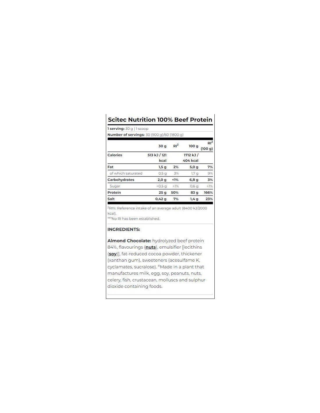 SCITEC 100% Beef Consentrate е висококачествена протеинова формула с чист телешки протеин, един от най-добрите изтичници на белтъчини, който осигурява всички ценни хранителни вещества, необходими на спортистите и активните хора, за да изградят качествен мускулна маса. Предимства: 100% телешки протеин концентрат Отличен източник на аминокиселини Обогатен с креатин Висока степен на усвояване Без захар 100% Beef Consentrate осигурява висока доза ензимно хидролизиран телешки протеин, произведен от прясна 100% натурална суровина, без никакви хормони. Благодарение на процеса на хидролиза, този протеинов източник се усвоява бързо и лесно от организма, като му осигурява всички необходими аминокиселини, включително девет незаменими, които тялото не може да синтезира само: хистидин, изолевцин, левцин, лизин, метионин, фенилаланин, треонин, триптофан и валин. Както знаем, аминокиселините са градивните елементи на протеина. Те играят важна роля в изграждането на мускулната тъкан и възстановяването на мускулните влакна след интензивни тренировки. 100% Beef Consentrate е чудесна алтернатива на млечните протеини и е особено подходящ за хора с непоносимост към лактоза. Формулата му е обогатена с креатин, един от най-разпространените суплементи сред спортисти и бодибилдъри, който осигурява допълнителна сила, енергия, мощ и поддържа клетъчната хидратация. Тази ефективна протеинова формула се отличава със страхотен вкус и еотлично допълнение към всеки режим за изграждане на мускулна маса. Препоръчителен дневен прием: Смесете 30 гр с 250 мл вода и консумирайте след тренировка.