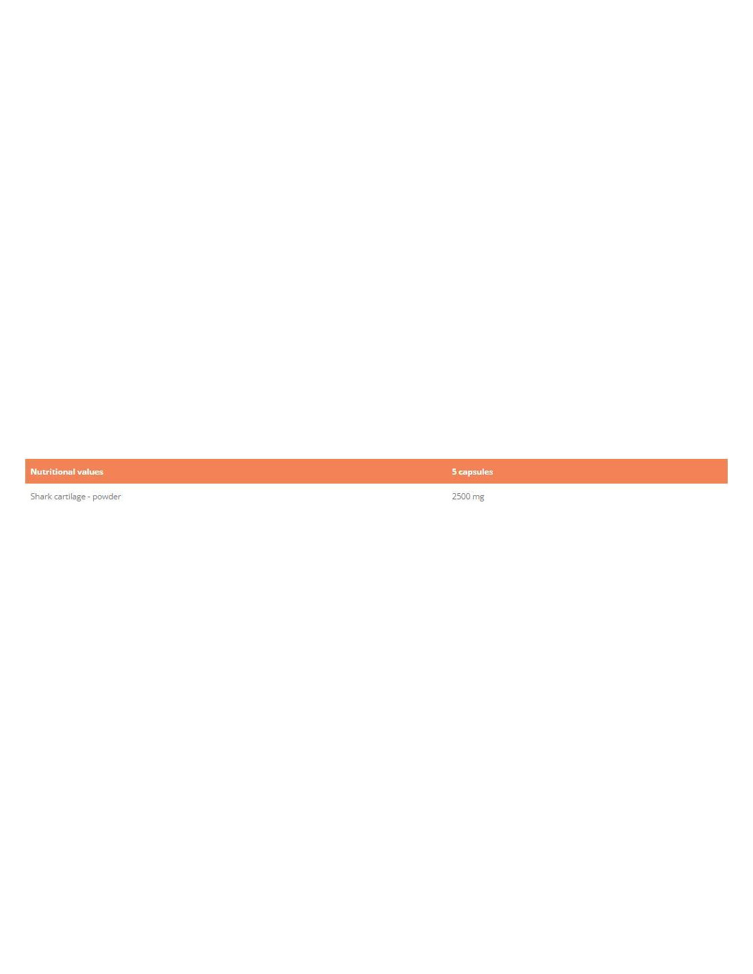 Хрущял от акула - природна хранителна добавка за стави в практичната форма на капсулиХрущялът от акула е природна хранителна добавка за стави. Той служи превенция и за поддържане на здрави кости и съединителни тъкани. Представлява комплекс от мукополизахариди, съдържащи протеинови вещества и глюкозамин и хондроитин. Това са основните компоненти на ставния хрущял и другите съединителни тъкани като кости, връзки и сухожилия. Хрущялът от акула също е богат естествен източник на калций и фосфор, които са важни минерали за поддържане на здрави кости и стави. Предлага се под формата на практични капсули, които осигуряват бързото и ефективно усвояване.Хрущялът от акула и неговите предимства природна добавка на ставите чист хрущял от акула подходящ не само за спортисти съдържа основни компоненти на ставния хрущял - глюкозамин и хондроитин източник на калций и фосфор, които спомагат за поддържането на здрави кости и стави предлага се под формата на практични капсули За кого е предназначен?Предназначен е като превенция за всички, които се грижат за двигателния си апарат, а също и за тези, които имат проблеми с него. СъставХрущял от акула - прах, средство против слепване (магнезиев стеарат), желатинова капсула. ДозиранеПриемайте по 4-5 капсули дневно след хранене.